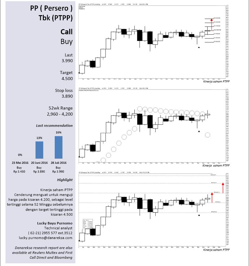 Kinerja saham PTPP cenderung menguat untuk menguji harga pada kisaran 4.200, sebagai level tertinggi selama 52 Minggu sebelumnya dengan target tertinggi pada kisaran 4.500. Info lebih lanjut klik disini